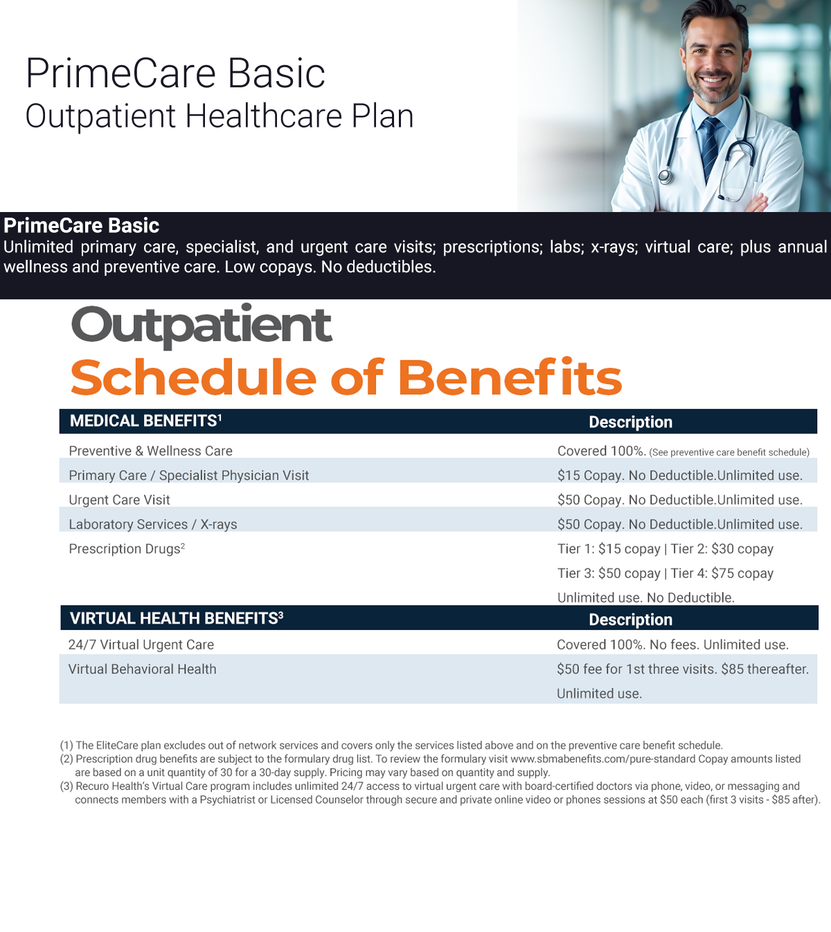 PrimeCare Basic plan does not provide any benefits for hospitalization, surgery, maternity, catastrophic illness, or emergency room visits.