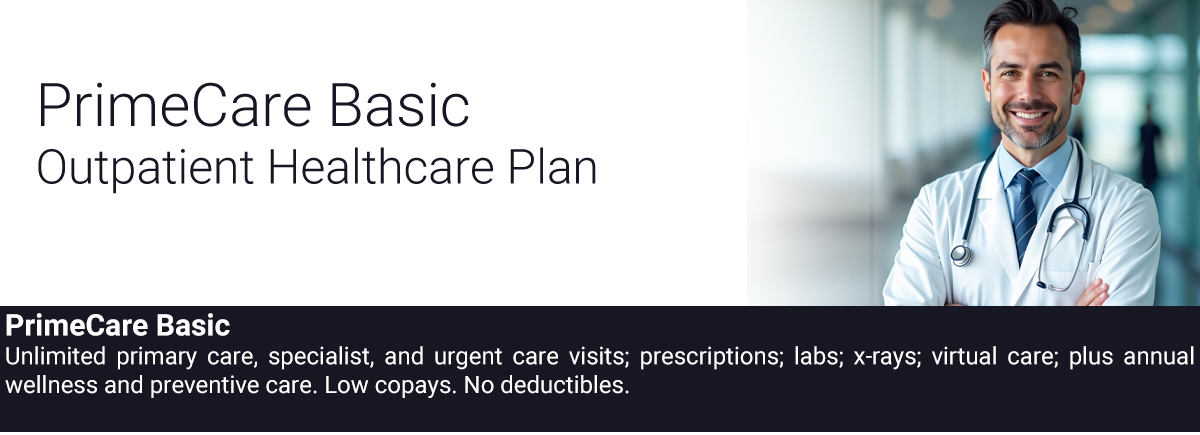 PrimeCare Basic plan does not provide any benefits for hospitalization, surgery, maternity, catastrophic illness, or emergency room visits.